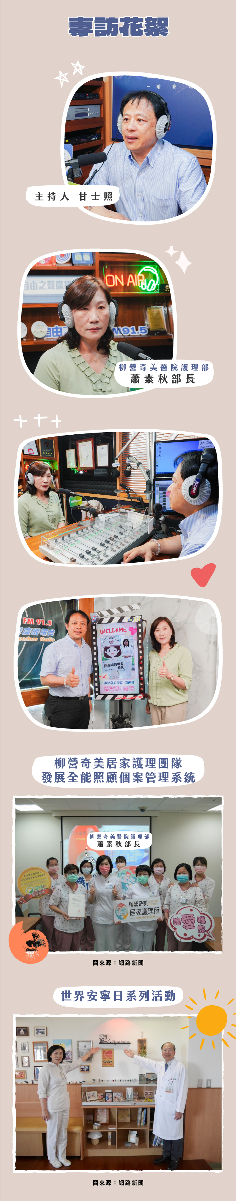 奇美醫療財團法人奇美醫院體系,分別為永康、柳營與佳里三院區,總床位超過2500床,醫護人員超過6000人,以「人本關懷、創新專業、連結效率」為核心,深化在地服務,提供大台南的鄉親醫護服務。柳營奇美醫院護理部蕭素秋部長表示,護理不是一份工作,而是一種信仰。除了院內醫療急性照護,偏鄉社區醫療照顧服務,居家醫療也陸續提供。