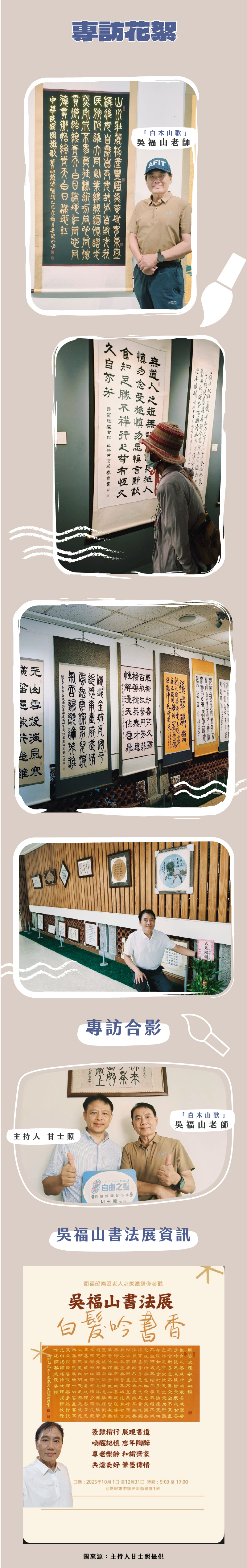 十月既是中華民國的光輝國慶月,亦逢九九重陽敬老節,象徵長者如松柏常青、德澤綿長。吳福山老師表示,書法是一種靜心的對話,也是人生歷程的印記。「我希望透過這次展覽,讓長輩在熟悉的詩文與墨香中,找回青春的記憶,也讓年輕一代體會筆墨裡的生命智慧。」在敬老與傳承的氛圍中,〈白髮吟書香〉以書為橋,串起世代情誼,讓文化的根與情感的花同時盛開。
