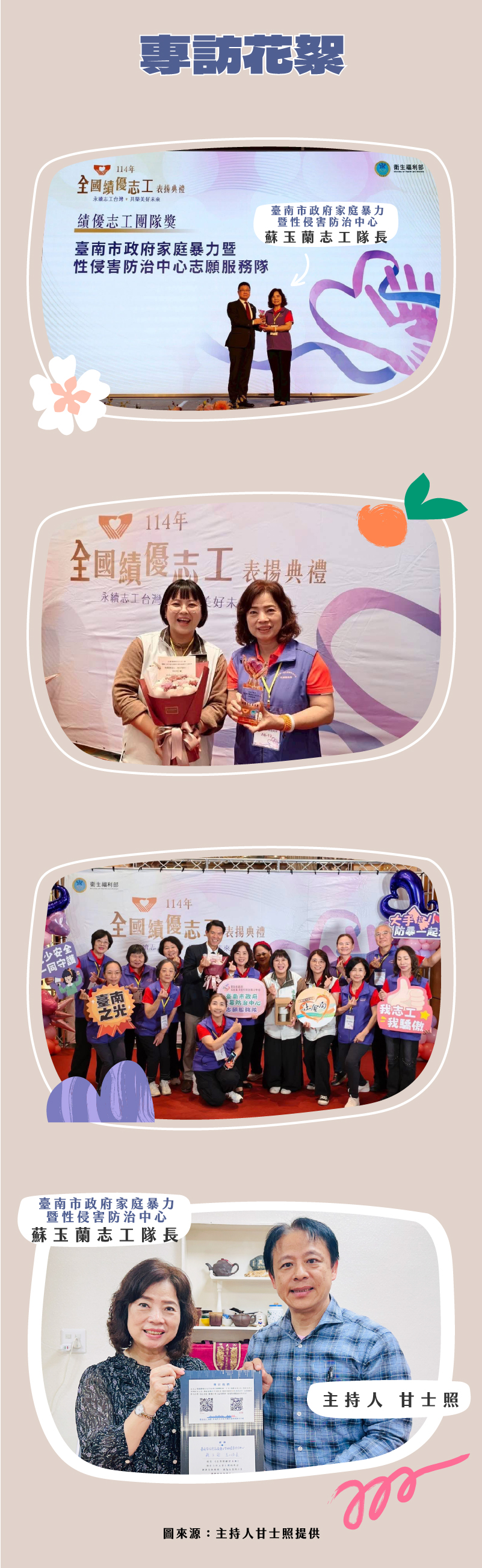 臺南市政府家庭暴力暨性侵害防治中心志願服務隊長期投入服務台值班、諮詢轉介、預防宣導,以及協助社工初評與關懷等工作,努力推動「暴力零容忍」的城市願景。隊長蘇玉蘭帶領志工穿梭市集、校園與社區,以親切的宣導與行動話劇,將艱深的防暴知識化為易懂故事,讓更多人學習如何保護自己。面對受暴者,她始終以最溫柔的方式陪伴:傾聽、陪同報案、提供資訊,協助他們重新踏回安穩生活。