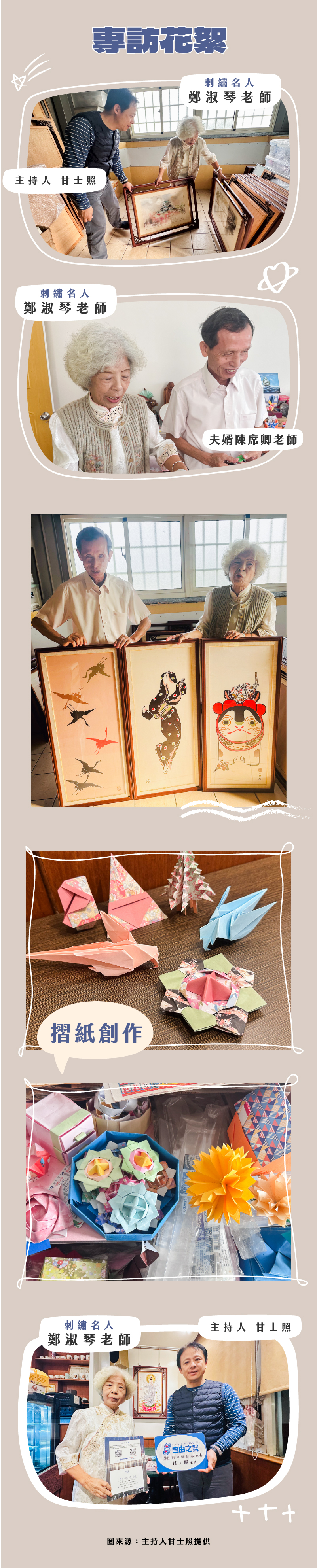 長期照顧好未來,刺繡摺紙歌傳頌,節目主持人甘士照邀請刺繡名人鄭淑琴老師專訪,分享一針一線刺繡情,一折一轉摺紙藝,雙手萬能的典範,透過巧思與結構的變化,發揮造型藝術、創意與專注力的展現,讓簡單的藝術在指尖流動,轉化成充滿喜悅與童心的神奇作品。經由客家民謠的演唱,與夫婿陳席卿老師,彼此陪伴鶼鰈情深,藝術結合樂齡人生。