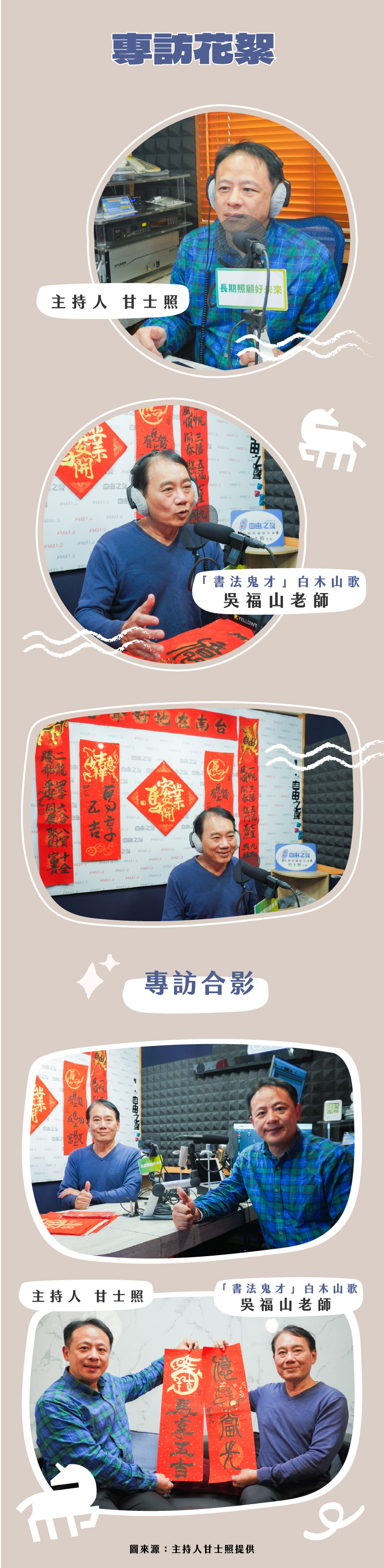 長期照顧好未來,馬年春聯舞春來,節目主持人甘士照邀請素有「書法鬼才」之稱,白木山歌吳福山老師專訪,分享馬年創意春聯與社區關懷故事,用神來之筆書繪春聯,見駿馬昂首騰躍,線條如行雲流水,寓意馬年吉運奔馳,吳福山老師的創意作品兼具民間生命力與書法韻律,讓年節創意祝福化為無限的能量。祝福大家億馬當先、馬享五吉。