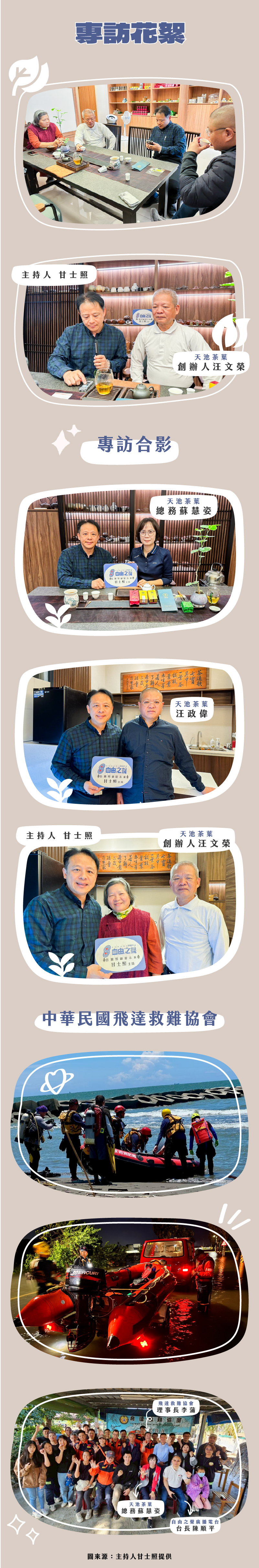 長期照顧好未來,天池茶葉救難情,節目主持人甘士照邀請天池茶葉創辦人汪文榮與總務蘇慧姿專訪,分享天池茶葉篳路襤褸創辦歷程,汪文榮堅持在一盞茶中,回到自然,製作自然好茶,以茶喻人生層次:少重滋味,中重回甘,老重意境;茶不在貴,心靜則香,待人修身,盡在一杯茶中。汪政偉與蘇慧姿伉儷在事業有成之時,吟茶道歌之餘,以茶修心、以行行善,將一杯茶的溫度,化為長久關懷飛達救難協會的力量。