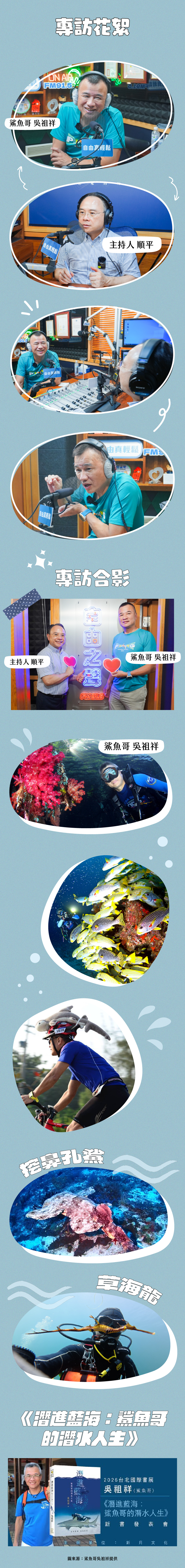 這一集,我們邀請到近期出版新書〈潛進藍海:鯊魚哥的潛水人生〉的「鯊魚哥」吳祖祥,帶來他與海洋交織數十年的生命故事。從最初學習潛水的契機,到他鍾愛的鯊魚種類,以及親眼觀察海中魚群逐漸減少的變化,他分享的不只是冒險,更是深刻的警訊。節目中也談及各地潛水經歷,以及轉變為海洋守護者的心路歷程。在一次次下潛與浮出之間,我們重新思考,人與海的距離,是否能更靠近,也更溫柔。