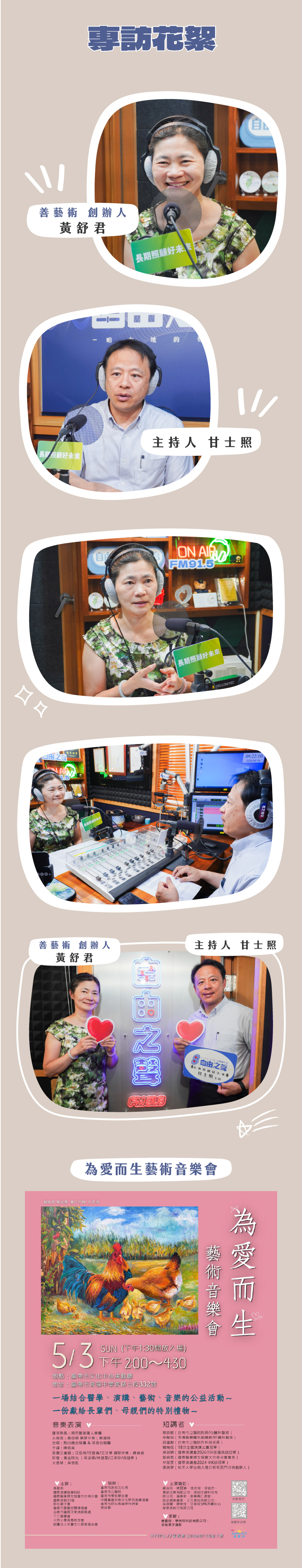 長期照顧好未來,為愛而生關懷來,節目主持人甘士照邀請善藝術創辦人黃舒君女士專訪,分享舉辦「為愛而生」公益藝術音樂會的發起緣由與核心精神,介紹活動內容與特色亮點,結合多個公益團體與善心企業,共同推動這場充滿溫度的公益盛會。希望在母親節前夕,藉此喚起社會對高齡者身心健康的重視,讓愛與關懷成為最真實的力量。